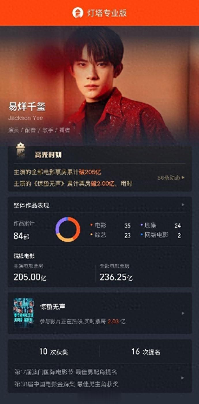 2月17日,据灯塔专业版数据, 易烊千玺主演电影累计票房已破205亿,为票房破200亿中国演员中唯一一位“00后”。目前,其主演的影片《惊蛰无声》正在热映中。