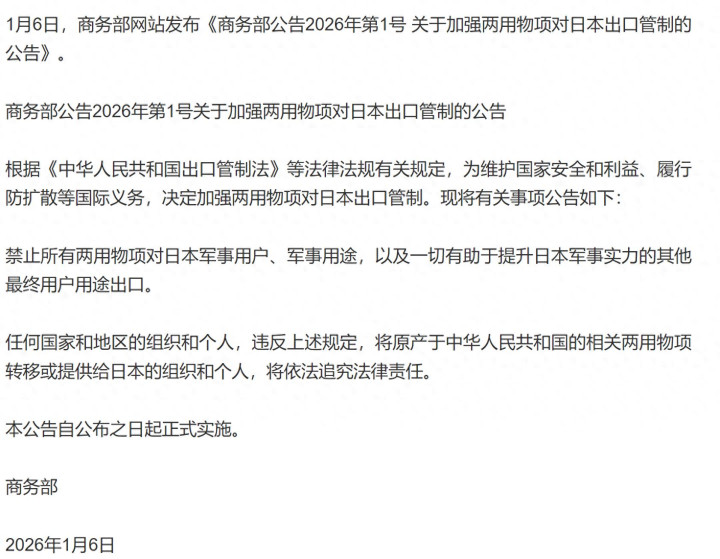 我们深知,他只是一个无关痛痒的人物,他一个人窜访台湾的举动,以及发表的台独言论,无法扭转台海的局势,更无法变更中国的节奏。虽然参议院在几经试探,日本现在根本不敢明面上和中国撕破脸,中国的反制已经以快准狠的姿态发出,根据《商务部公告2026年第1号公告》显示,对日本进行两用物项的严格出口管控。军民两用的物资,但凡是要流入日本市场,必须经过层层检验,层层审议,这会直接导致日本对应工业领域受到影响。