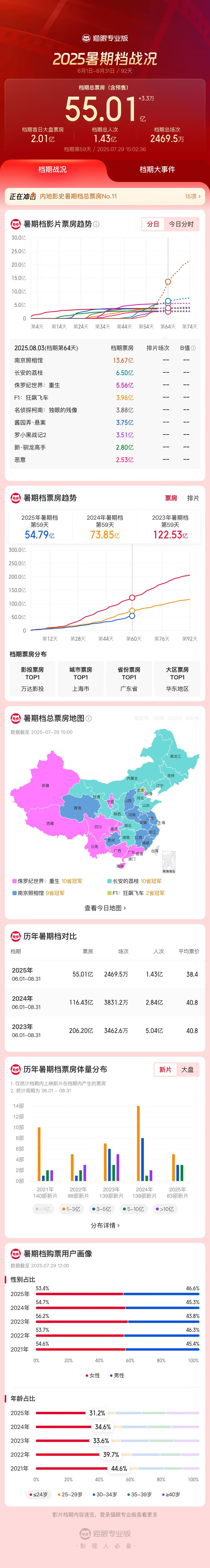 上证报中国证券网讯(记者 杨翔菲)据猫眼专业版数据,截至7月29日15时01分,2025年电影市场暑期档总票房(含预售)已破55亿元,《南京照相馆》登顶2025年暑期档票房榜,成9省票房冠军。