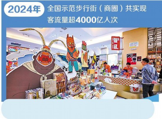 步行街(商圈)是城市商业的发源地和核心区。近年来,我国先后确认19条全国示范步行街、20个全国示范智慧商圈,不断推动现有步行街(商圈)设施改造和业态升级,抓住步行街(商圈)发展的“小切口”,做好经济高质量发展的“大文章”。数据显示,2024年,全国示范步行街(商圈)共实现客流量超4000亿人次、营业额超5000亿元,创造就业岗位超80万个,为各地促消费、扩内需、稳就业提供了有力支撑。